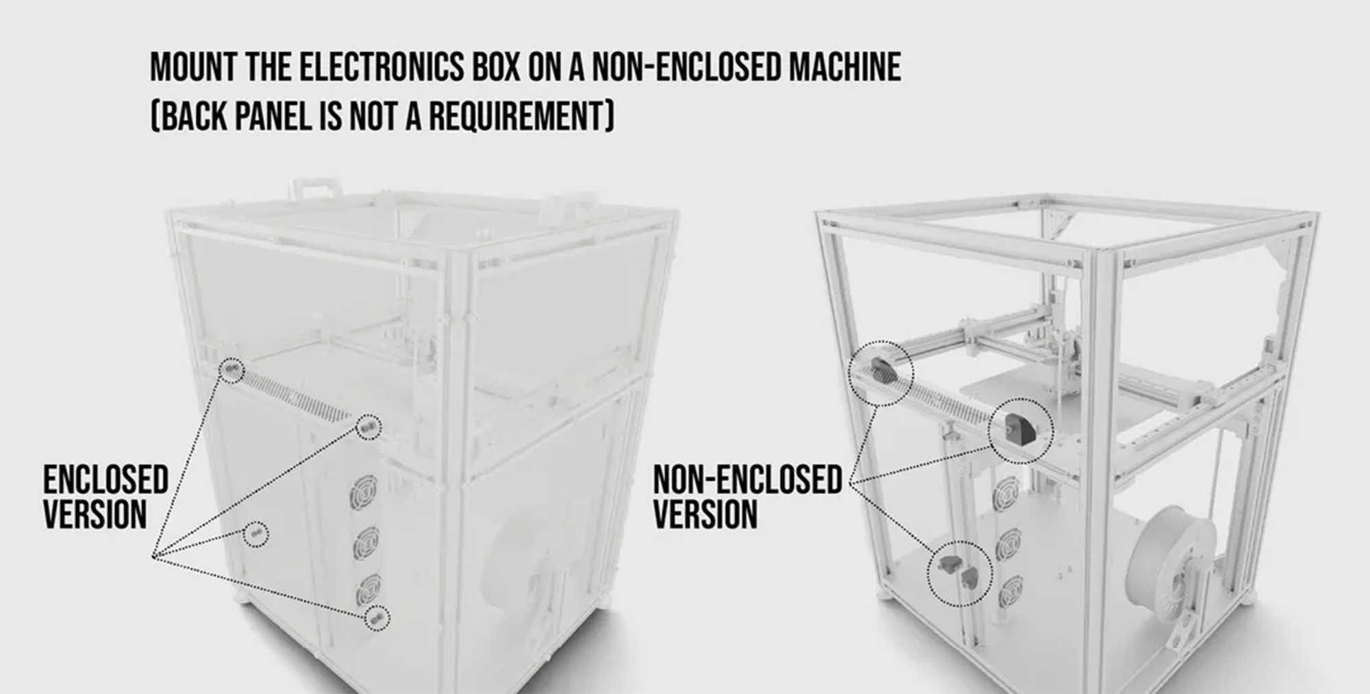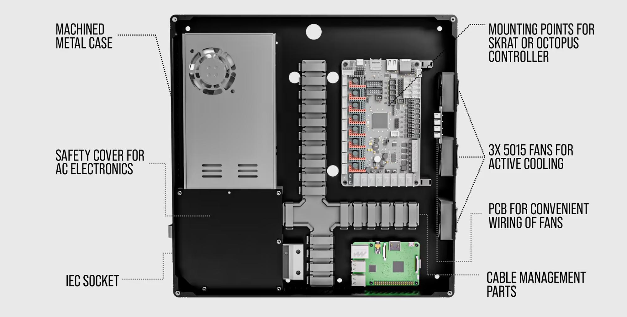 Electronics Kit (optional): A complete bundle with every electronic component needed for our standard build (motors, controllers, hotend, extruder, fans, wiring & connectors)